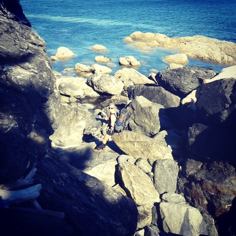 Still stoked we were early and made it through the cave the next challenge that needed our remaining attention came up: big boulders along the shore. With big holes between them and ocean water which makes them slippery. Last challenge. We got over the field without any major incidents and where happy to see that the bay we walked towards had some tents sitting right at the water. Made it to the next camp, yes!