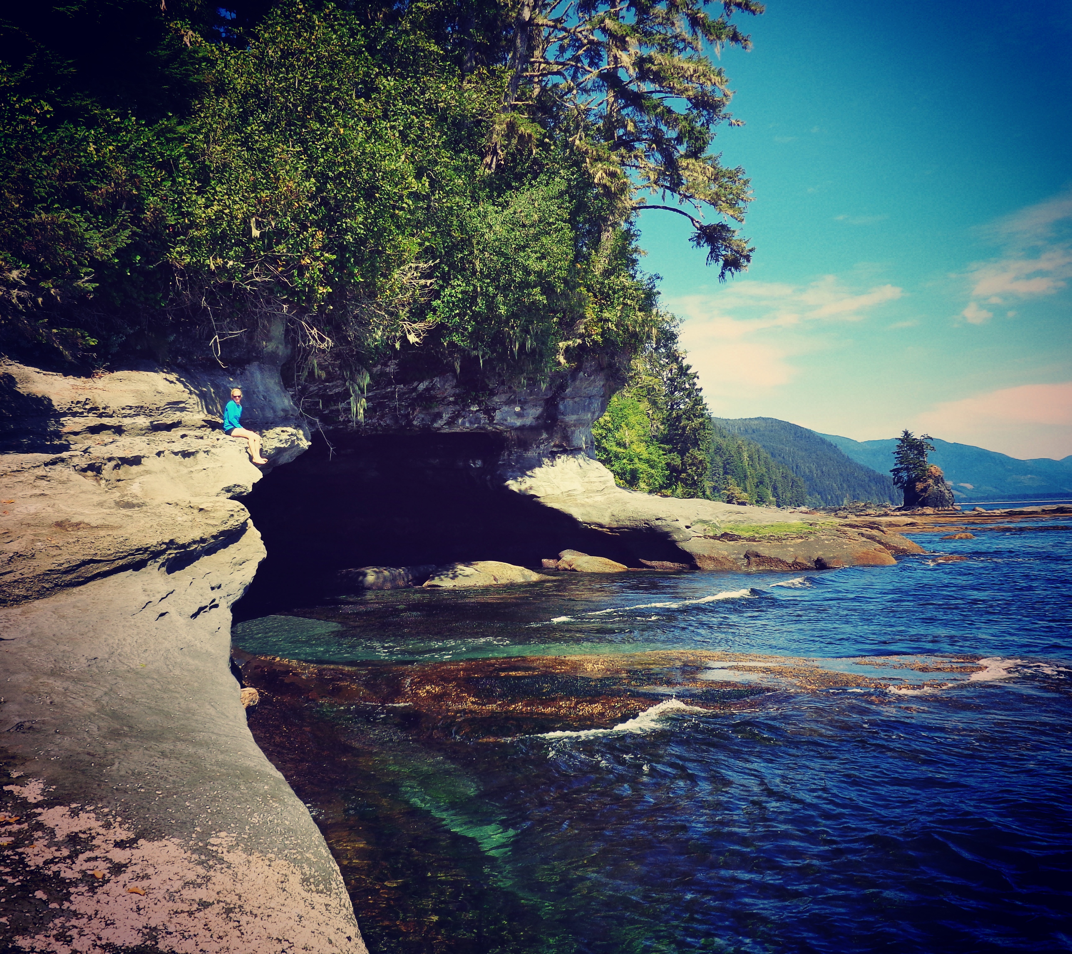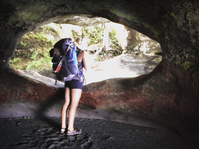 With more caution and after a couple of deep breaths we continued. We passed Owen’s Point with the water just low enough to make it around the corner. But then the tide forced us to a break. To continue we needed to leave the cliff, go down to the sandy beach and cross a cave which lead us back to the trail. The cave was still half way full with water, so we sat down in the sun and had a little nap as the water slowly made its way back into the ocean.