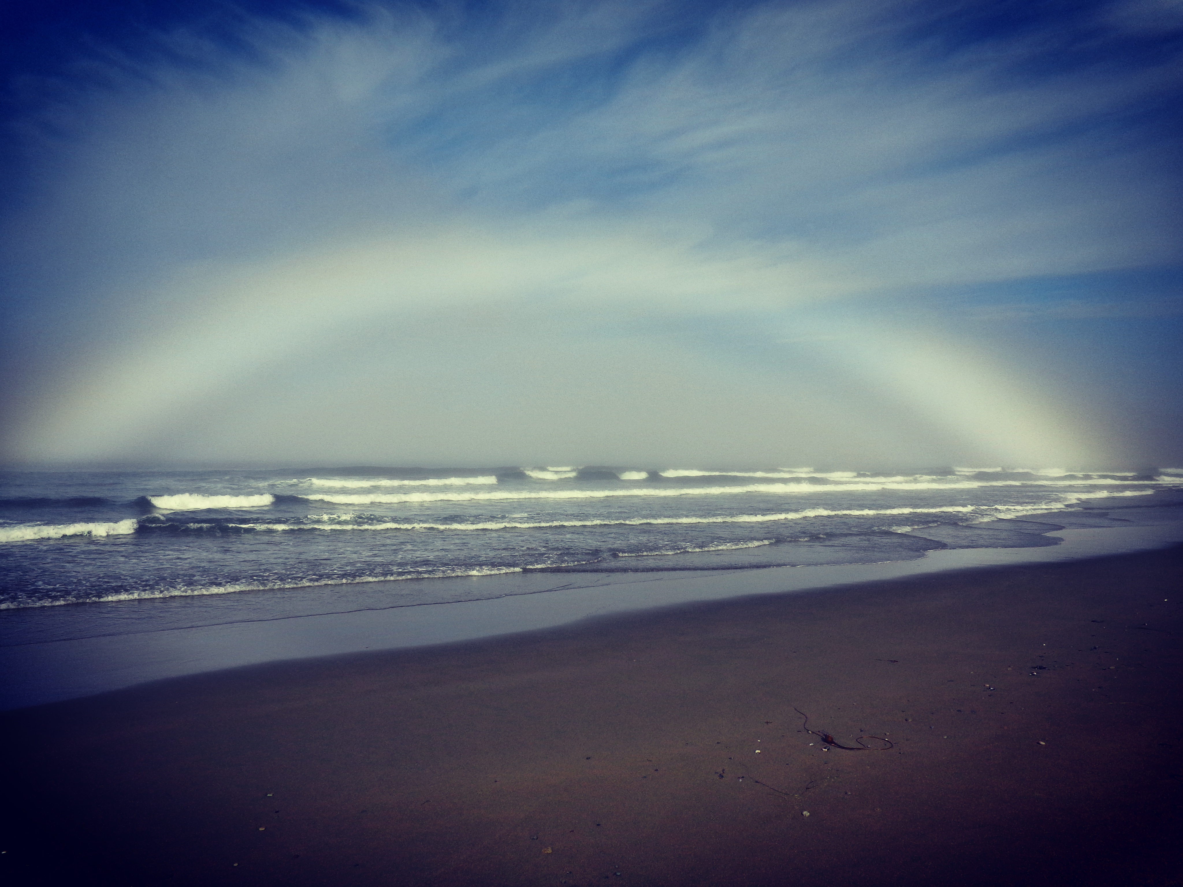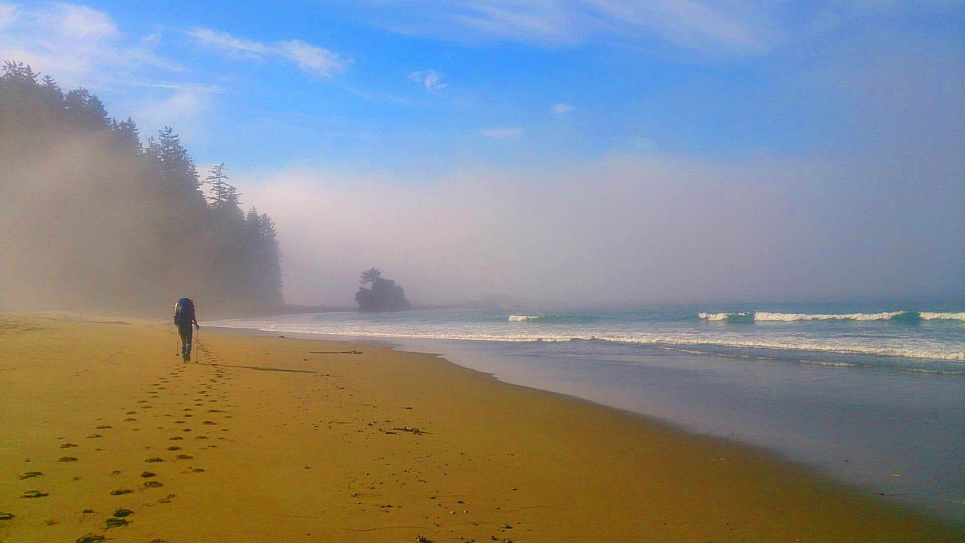 Breaking camp a matter of routine now, we started walking early. At the beach right into an awesomeness of sunrise, fog and rainbows. In such moments I wonder if there is any other person on the planet as happy as me right now.