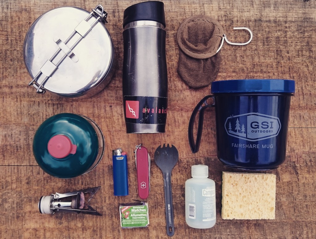 I have a fist-sized stove, the “pocket rocket” which works with the normal propane cans. In a small 500ml pot I cook. Water for dehydrated meals, oatmeal or coffee. It’s also the perfect size to cook some pasta and then throw some tuna and things in there. I prepare and also eat the food right out of the pot. No dishes, it’s just another thing to carry and clean. I prepare my coffee in my mug with a cloth. Same mug is good for wine or hot chocolate at night. It all tastes the same in the end, but who cares 😉